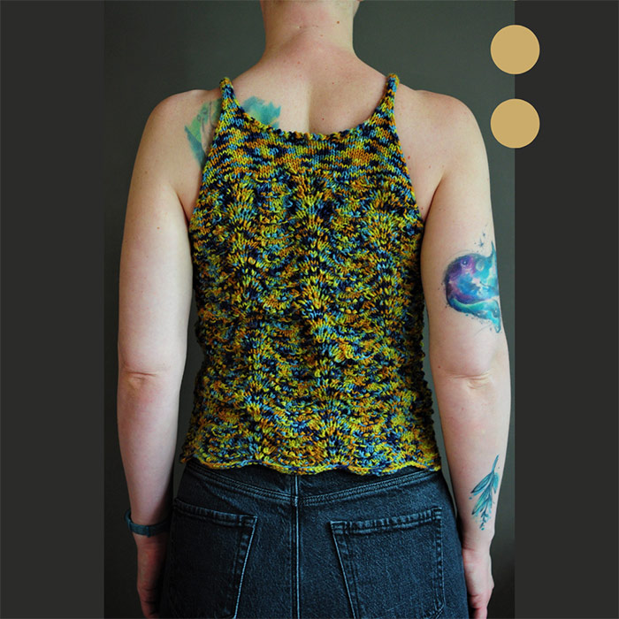 Фаворитка з усіх наявних наразі майок - саме ця. Лишень погляньте на ці кольори! Меланжева кольорова ниточка містить в собі неймовірне поєднання кольорів, а візерунок плетіння додає фактурності цьому виробу та робить його ідеальним. Це саме той момент, коли майка не надто яскрава, але не помітити її важко.