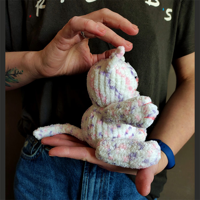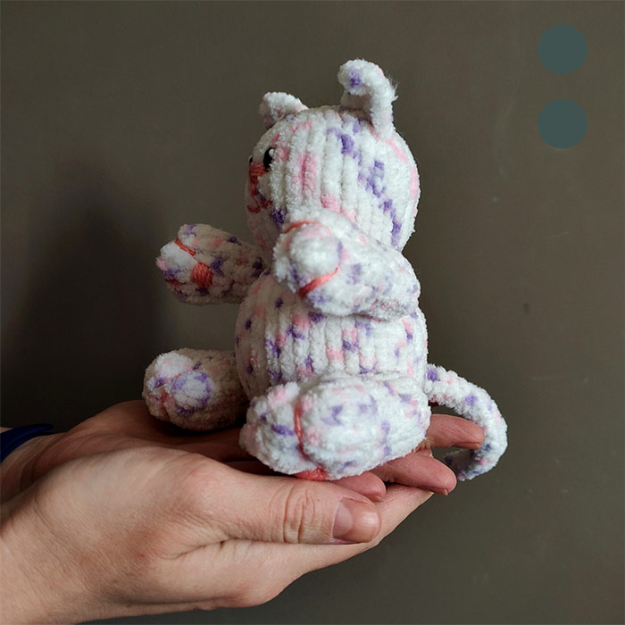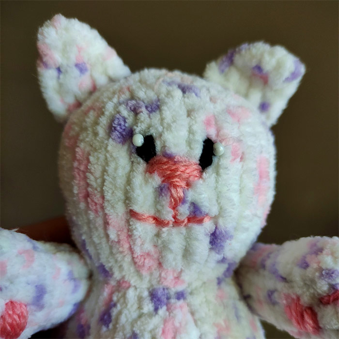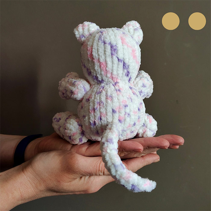 Неймовірно пухкенький на вигляд та на дотик - котусик. Пряжа, з якого його виконано, поєднує в собі всі відтінки літніх романтичних квітів: лаванду, рожевий та білий.